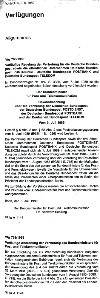 Mit einer Bekanntmachung im Bundesanzeiger Nr. 124 vom 7. Juli 1989 und im Amtsblatt des BMPT Nr. 86 vom 3. August 1989 - Verfügung 768/1989 regelte der Postminister die Vertretung der Deutschen Bundespost und der 3 Nachfolgeunternehmen: