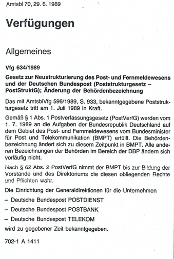 Aufgrund des Artikels 5 des Poststrukturgesetzes vom 8. Juni 1989 wurde im Bundesgesetzblatt Teil I Seite 1449 vom 21. Juli 1989 die Neufassung des Gesetzs über das Postwesen und in derselben Ausgabe des Bundesgesetzblattes, Seite 1455, die Neufassung des Gesetzes über Fernmeldeanlagen bekanntgegeben. Beide Gesetzes-Neufassungen wurden auch im Amtsblatt des Bundesministers für Post und Telekommunikation bekanntgegeben: Das Postgesetz im Amtsblatt Nr. 87 vom 3. August 1989 und das Gesetz über Fernmeldeanlagen im Amtsblatt Nr. 90 vom 10. August 1989.