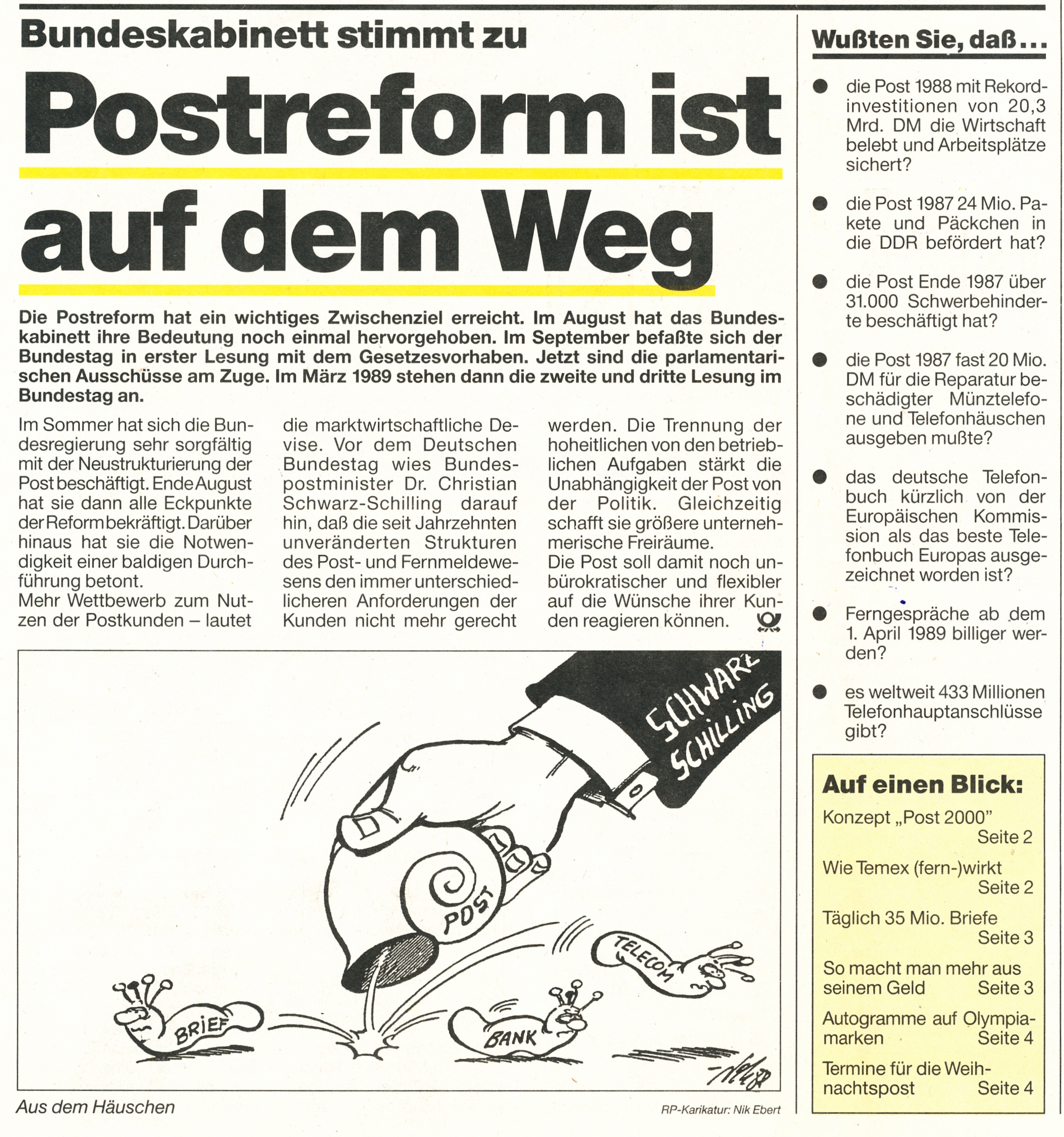 In vielfältiger Weise informierte die Deutsche Bundespost schon 1988 die Öffentlichkeit und auch die Postmitarbeiter über Gründe und Ziele einer Neustrukturierung des Post- und Fernmeldewesens. Hier eine Auswahl: