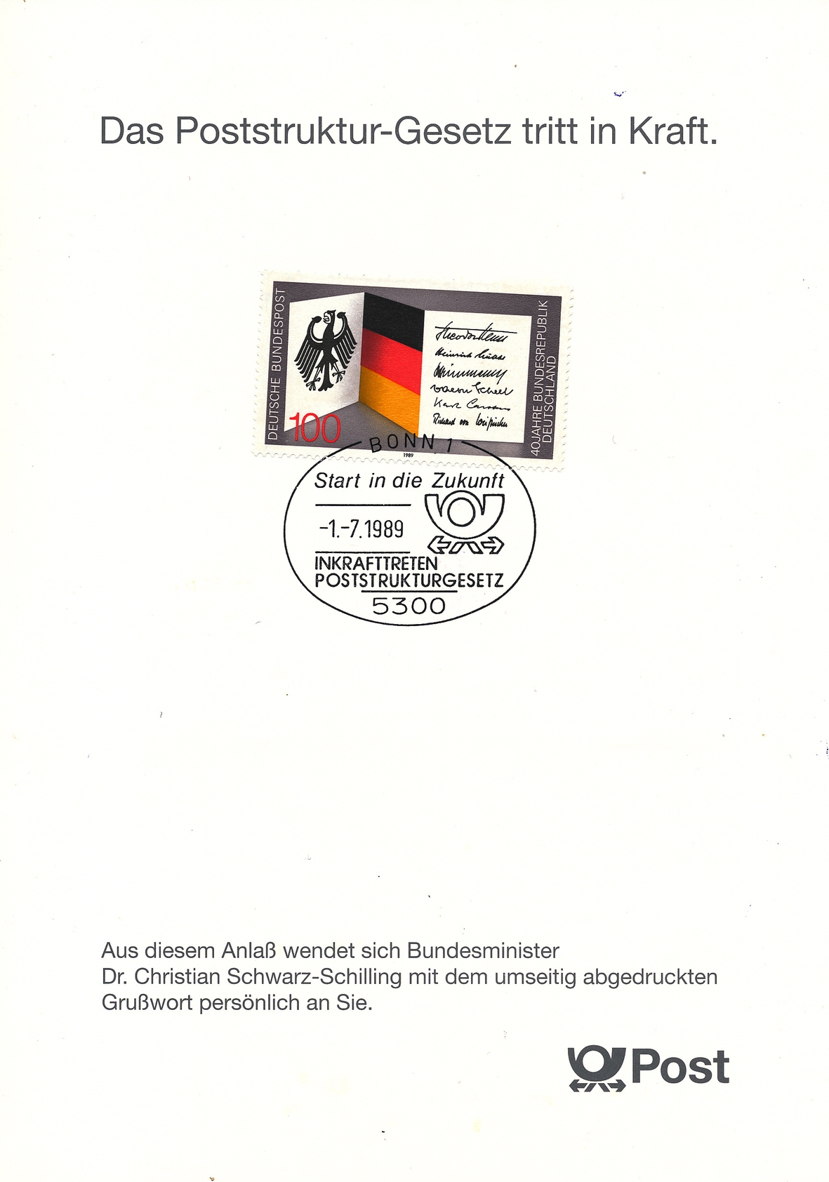 Am 1. Juli 1989 trat das „Gesetz zur Neustrukturierung des Post- und Fernmeldewesens und der Deutschen Bundespost” vom 8. Juni 1989, kurz: Poststrukturgesetz (PostStruktG) in Kraft (BGBl I S. 1026). Damit beginnt eine neue Geschichtsperiode in der 500-jährigen Geschichte des Postwesens in Deutschland.