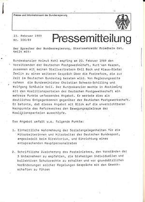 Am 22. Februar 1989 empfing Bundeskanzler Helmut Kohl den Vorsitzenden der Deutschen Postgewerkschaft, Kurt van Haaren, und seine Stellvertreter zu einem Gespräch über die strittigen Themen der Postreform. Das Ergebnis gab die Bundesregierung in einer Pressemitteilung am 23. Februar 1989 der Öffentlichkeit bekannt. Hier die vollständige Pressemitteilung vergrößert |