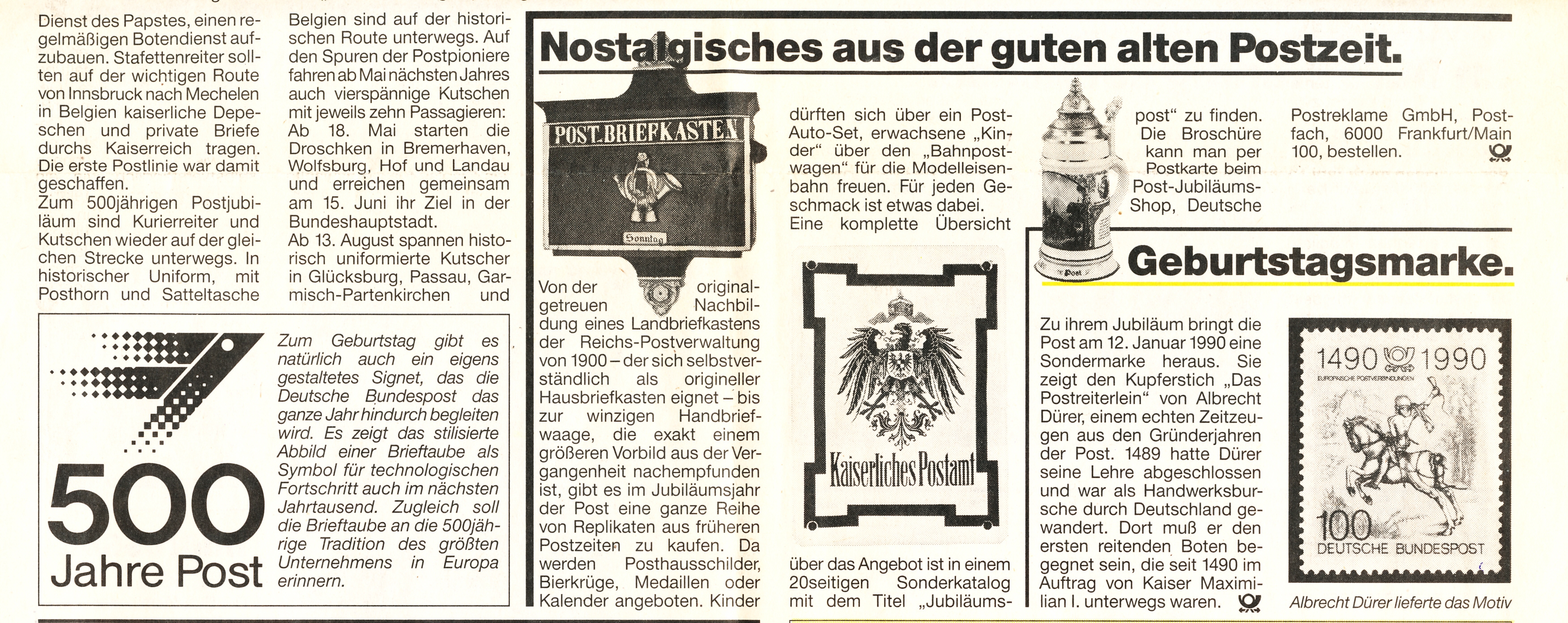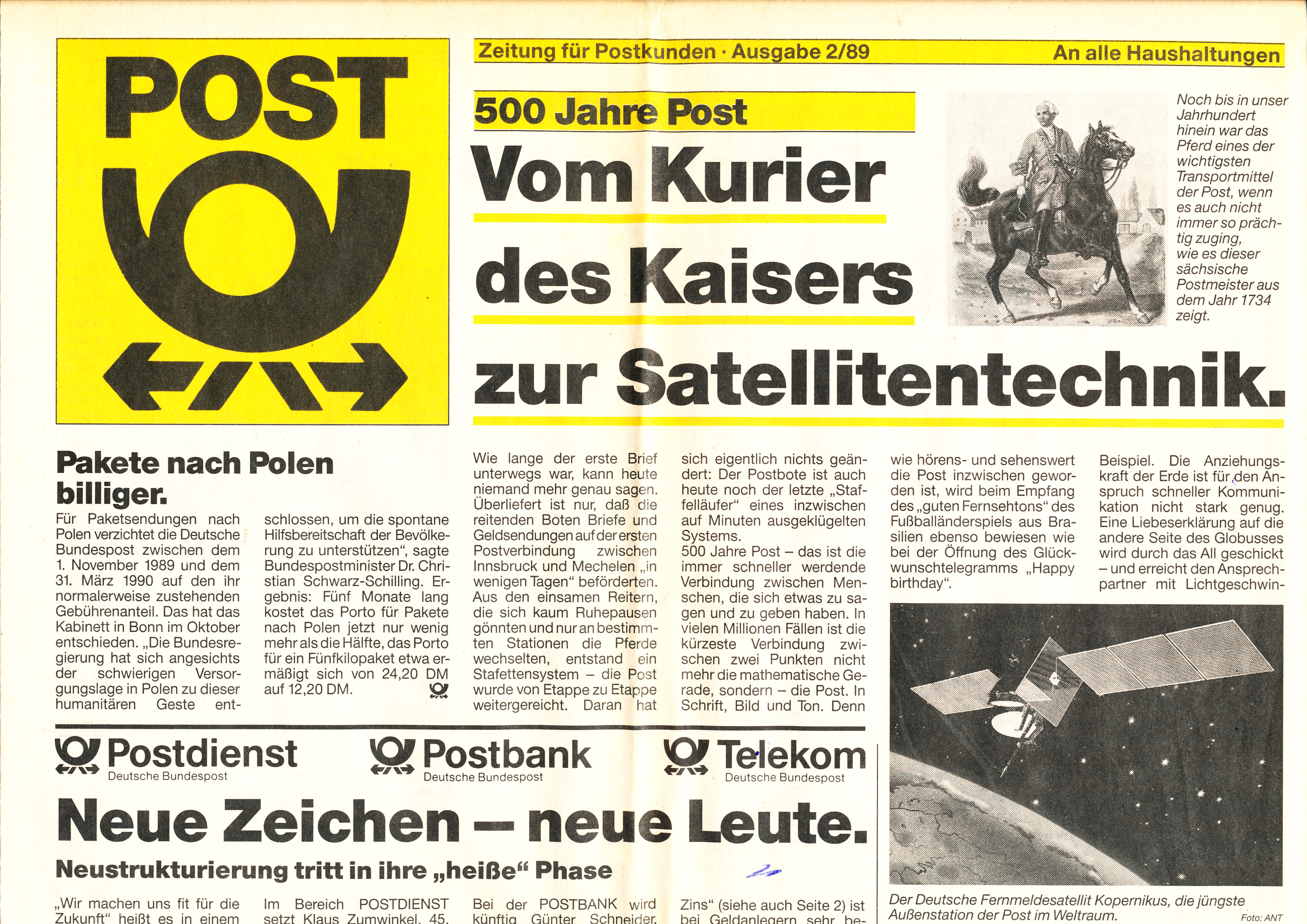 aus „Zeitung für Postkunden” Nr. 2/1989, Themen u.a. Postreform und 500 Jahre Post Bild 1 vergrößert Bild 2 vergrößert |
