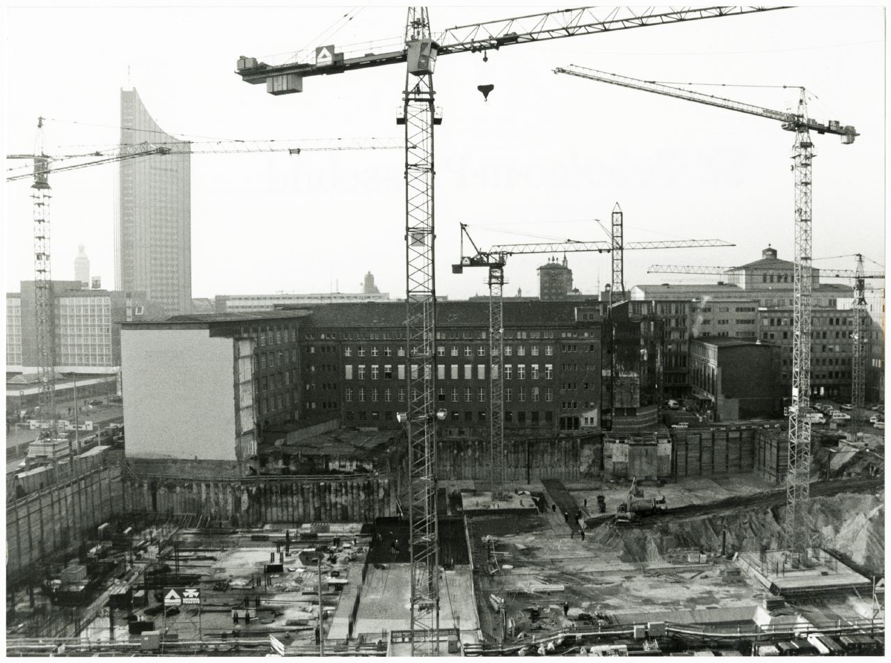 rechts: Tiefbauarbeiten am Neubau des Fernmeldeamts der Deutschen Bundespost TELEKOM in Leipzig, um 1992