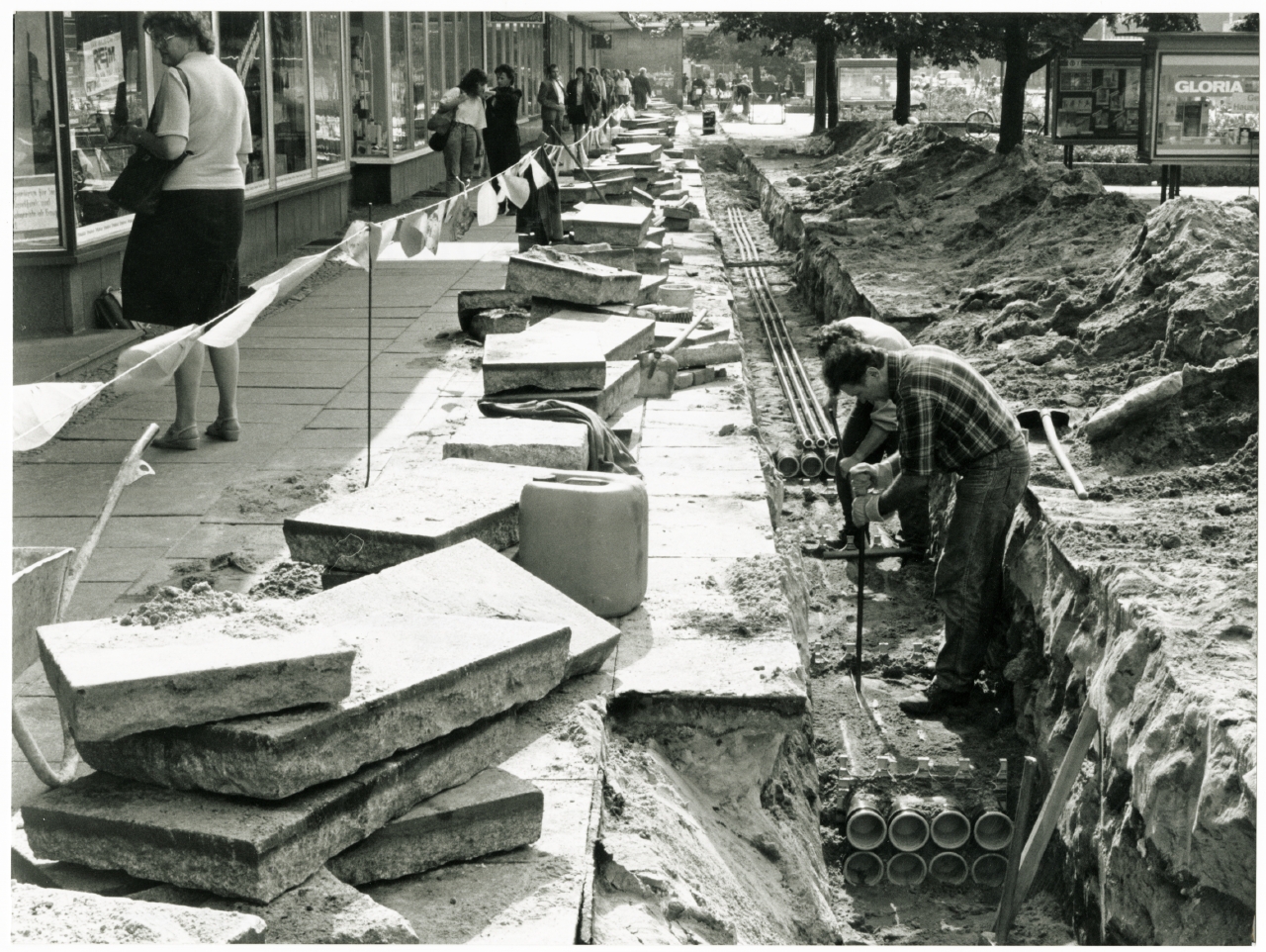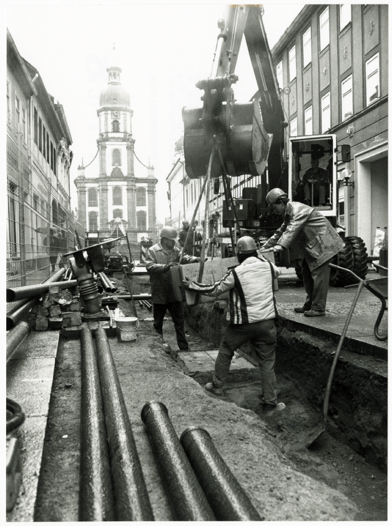 rechts: Verlegung von Kabelkanalanlagen durch Mitarbeiter der Deutschen Bundespost TELEKOM im Stadtzentrum von Suhl, um 1992
