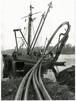 rechts: Verlegung eines Fernmeldekabels der Deutschen Bundespost TELEKOM mithilfe zweier Spülschiffe in der Havel zwischen Potsdam und Berlin, um 1992