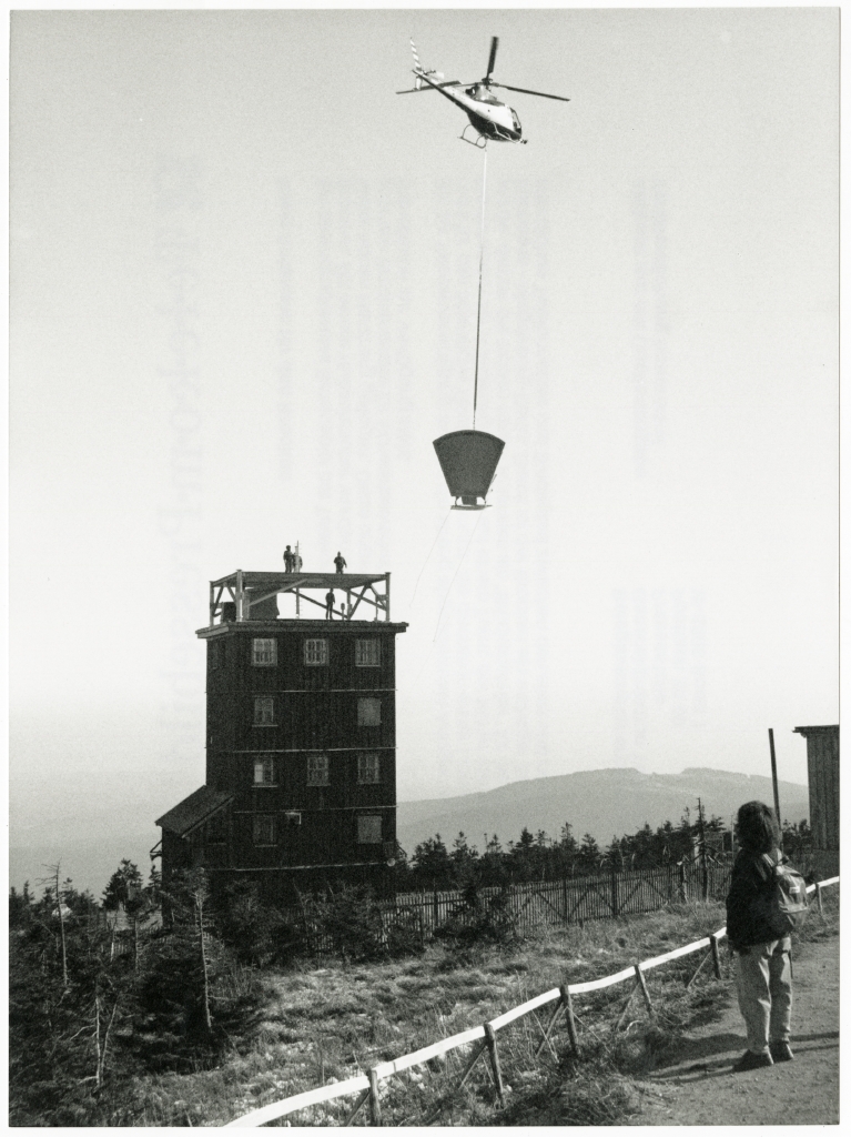 links: Montage von Sende- und Übermittlungseinrichtungen der Deutschen Bundespost TELEKOM auf dem Brockenturm im Harz mithilfe eines Hubschraubers, um 1992