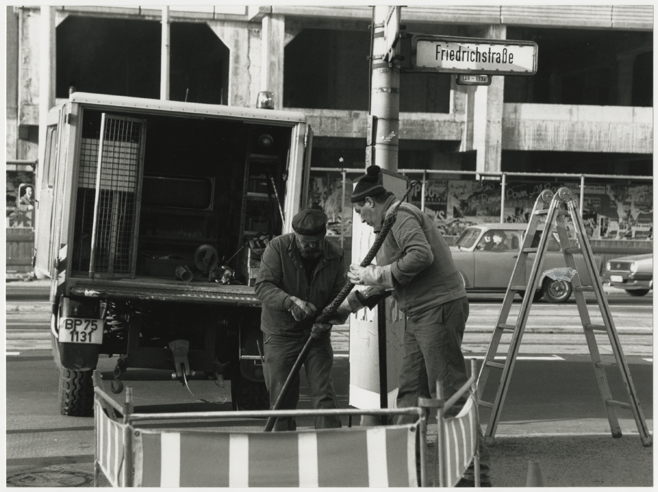 links: Mitarbeiter der Deutschen Bundespost TELEKOM bei der Verlegung eines Fernsprechkabels in Berlin, Friedrichstraße, 1991